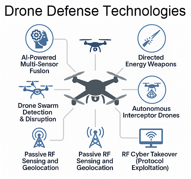 | 6. Countermeasures | RF Jammer / Hijack | DroneShield, Net Gun | Takeover or jam |