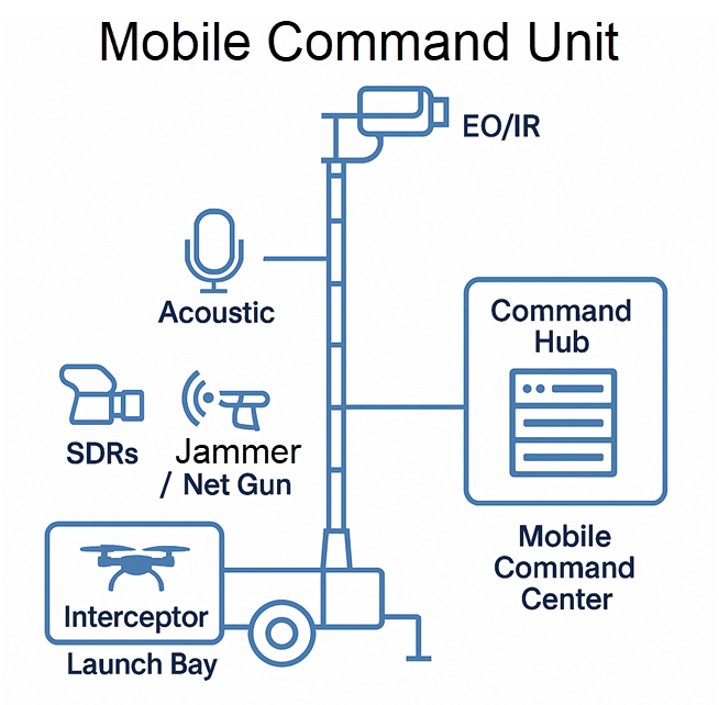 | 1. Early Warning | Passive RF Detection | RTL-SDR, HackRF, RFeye | Detects controller signals |