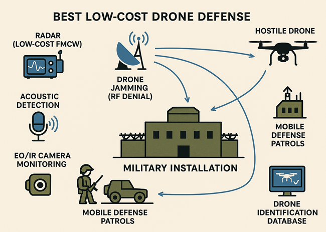 Defending military installations from hostile drones on a low budget requires a layered approach using cost-effective, scalable technologies. The key is to detect, identify, and disrupt drones before they can do harm, using off-the-shelf components and smart integration. Here's a practical and low-cost strategy: